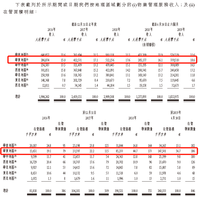 翻阅保利物业的招股说明书,其华东地区在管面积占比由2017年的22.2%快速上涨至2018年的44.7%,并在2019年年中进一步增至56.7%。华东地区作为保利物业公共服务的主战场,其同期取得的营收占比却不升反降,即由2018年的17.6%下降至2019年年中的16.1%。