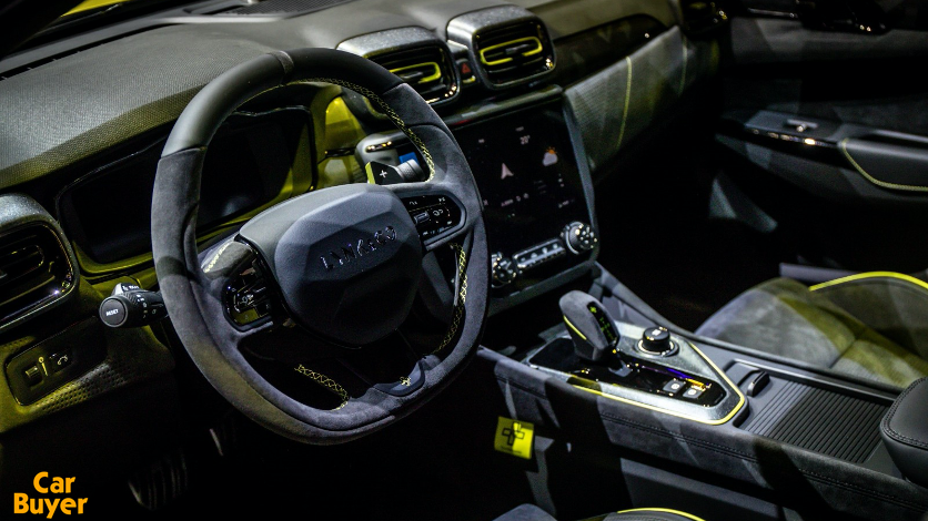 在内饰部分,领克03+虽然设计语言和普通车型相同,但由于采用了个性的黄色+黑色的组合,使得车内战斗感十足。另外在材质用料上,大面积采用了性能车、跑车上常见的Alcantara,手感和舒适度均为一流水准。