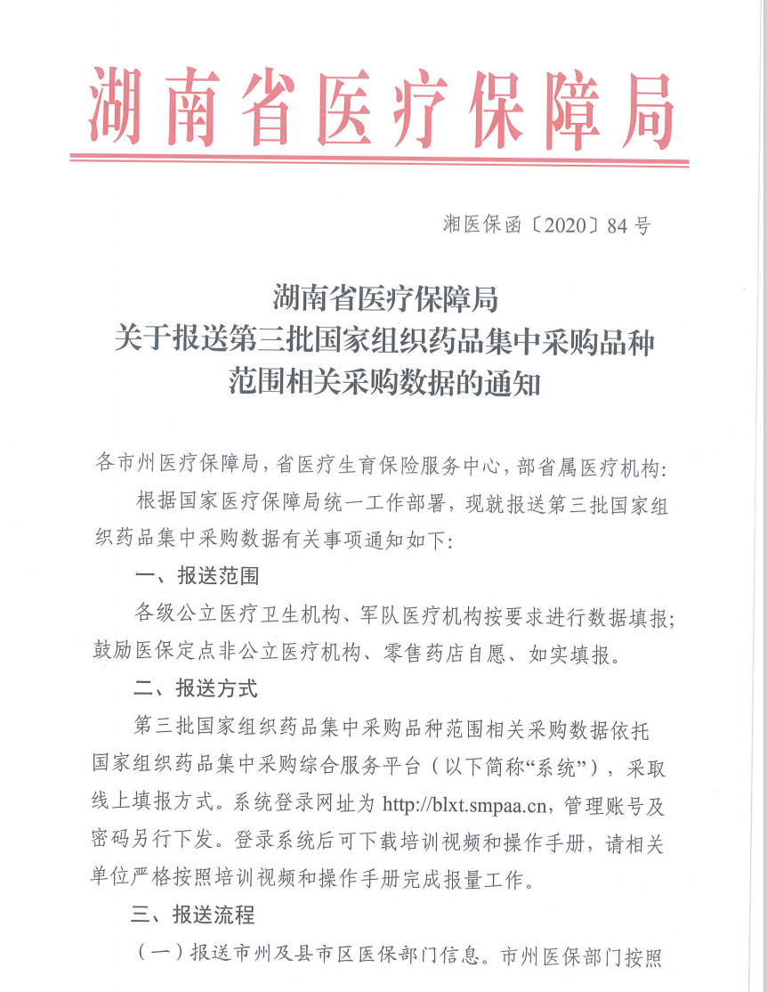 6月18日下午,国家集采会议在线上召开,业界据此认为第三批国家带量采购的启动已是“箭在弦上”,随后多个第三批带量采购品种目录传言版本流出。而界面新闻6月22日得到一份湖南省医疗保障局下发的《湖南省医疗保障局关于报送第三批国家组织药品集中采购品种范围相关采购数据的通知》,通知中附件部分正式透露出本次国家带量采购所涉及的药品品种。