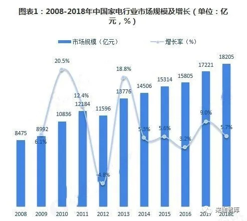 其实家电行业的智能化从十年前就已经开始,特别是近年来随着5G、人工智能技术等信息化技术大力发展,智能化风潮席卷家电行业,中怡康数据显示,2008年,我国家电行业(含3C手机数码)市场规模为8475亿元;到2018年,家电市场规模已达17049亿元,十年间规模翻番,可见增速之迅猛。
