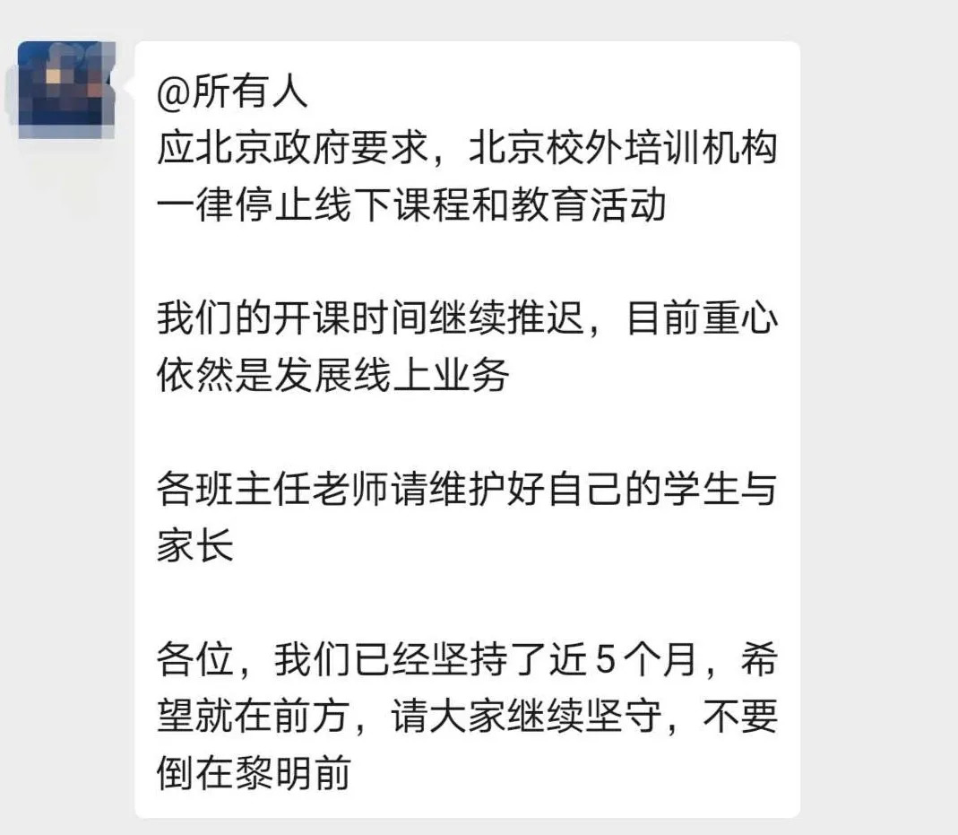 贾政第一时间就感觉不妙。果不其然,新闻发布会之后,他就收到领导的紧急通知,受北京疫情二次爆发影响,线下业务需要继续蛰伏,希望大家维护好自己的学生和家长,“继续坚守,不要倒在黎明前。”