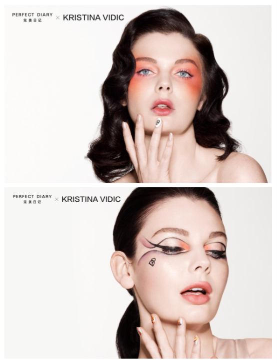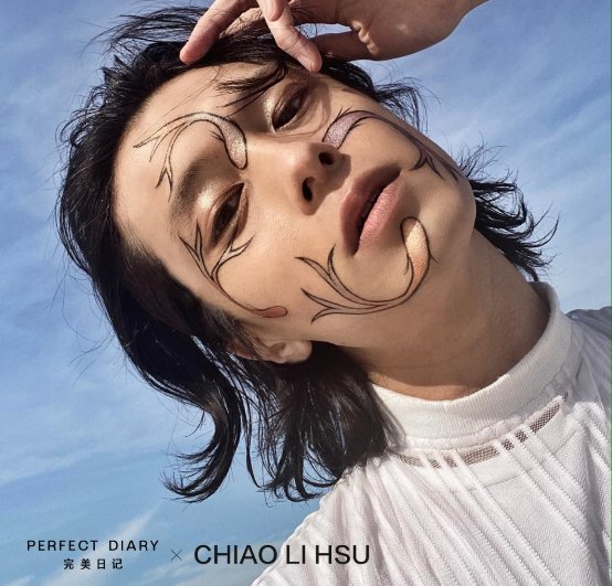 其实美妆也不仅仅只是局限于妆容的表达,更是像电影情节里镜头展现的“说话方式”。因为妆容与五官的紧密联系,让妆容也得以成为有叙事能力的媒介工具。非常具有故事叙述性的照片配上夸张的艺术妆容,想必也是完美日记想要去追寻和表达的新时代审美潮流。