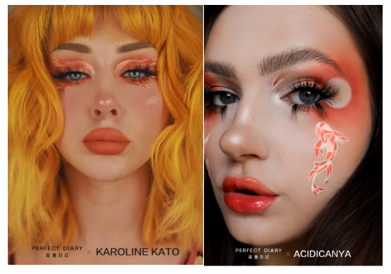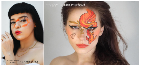 在诠释“锦鲤艺术妆”这个主题上,完美日记携手的这几位海外知名艺术家都用了自己的方式去表达对于中国元素的理解。比如像Karoline Kato和Anna (acidicanya)这样的时尚创意艺术家就用了鱼尾,落日,波浪涟漪的笔触去创作这个极具想象力的妆容。