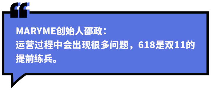 新锐品牌MARYME创始人邵政表示,618做不做得好,直接影响到双11团队执行力及团队找资源花钱的能力,这是团队一次运营实战练兵。