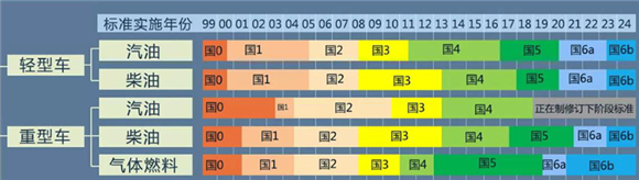 实施新车污染物排放标准升级对机动车污染物减排具有显著成效。国六排放标准是国五标准的升级版,分为6a和6b两个阶段,对应不同的技术要求和实施时间,6b较6a更为严格,部分指标严于欧六标准,可以说是世界上最为严格的机动车排放标准之一。国六b阶段标准的CO(一氧化碳)、THC(总碳氢化合物)、NMHC(非甲烷碳氢化合物)、NOX(氮氧化物)、PM(颗粒物)排放限值相比国五阶段分别加严了50%、50%、49%、42%、33%,并且对PN(粒子数量)也有了限值规定。