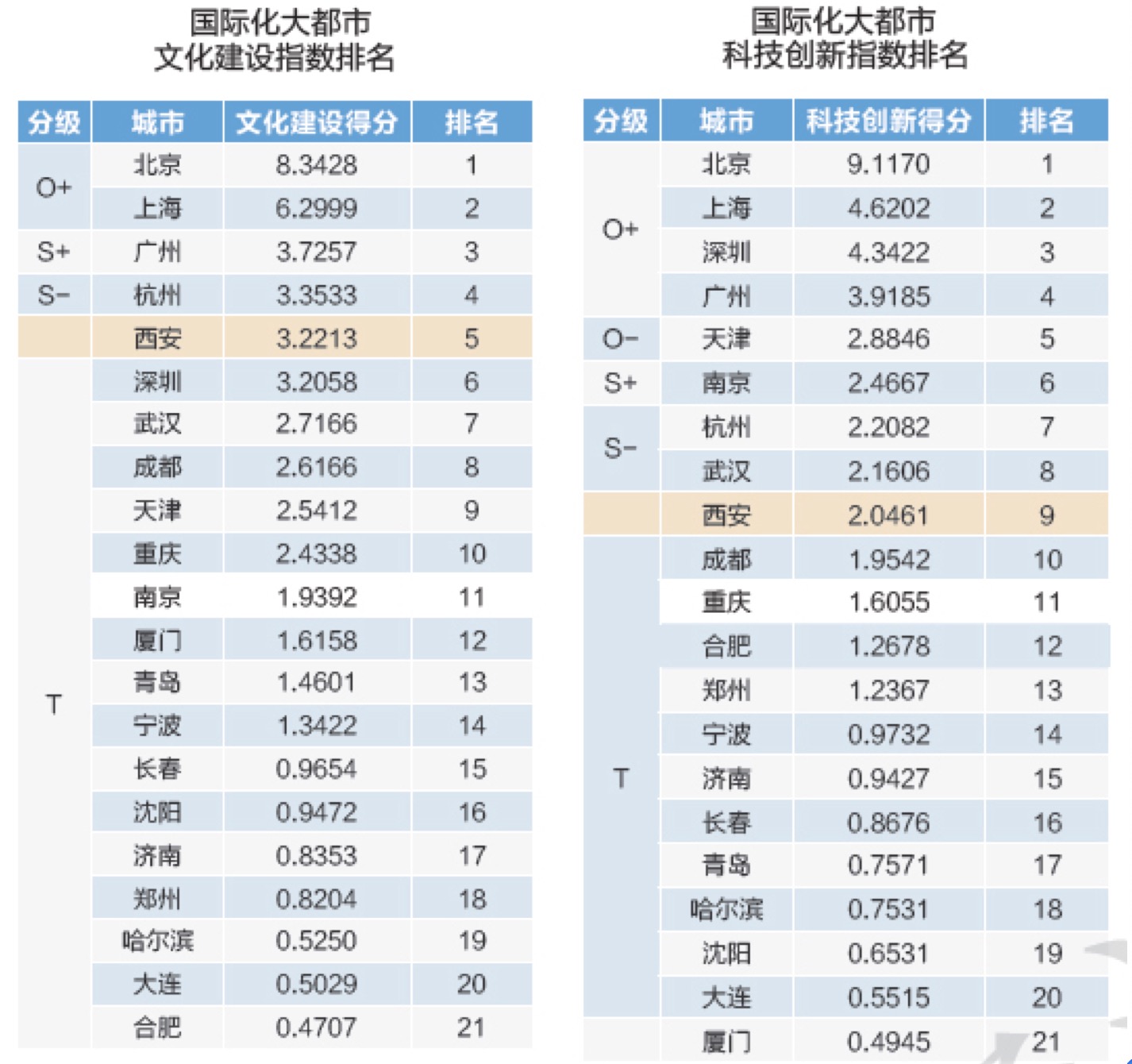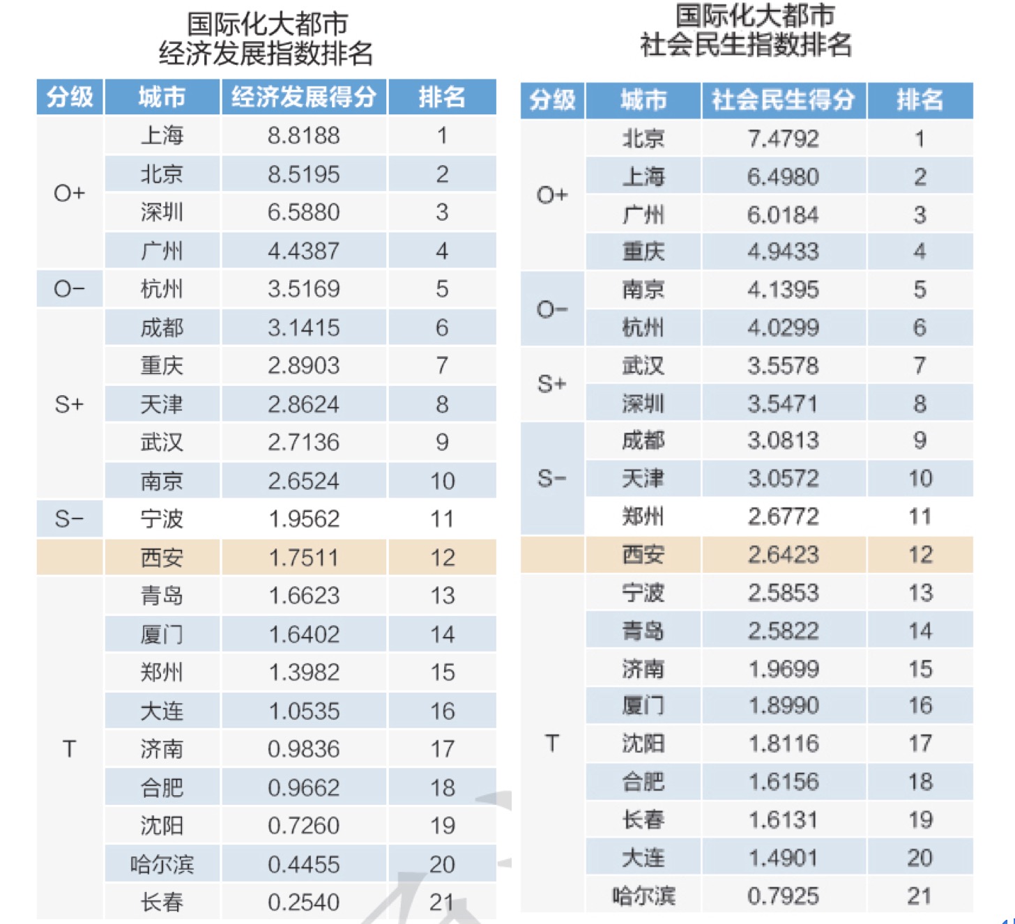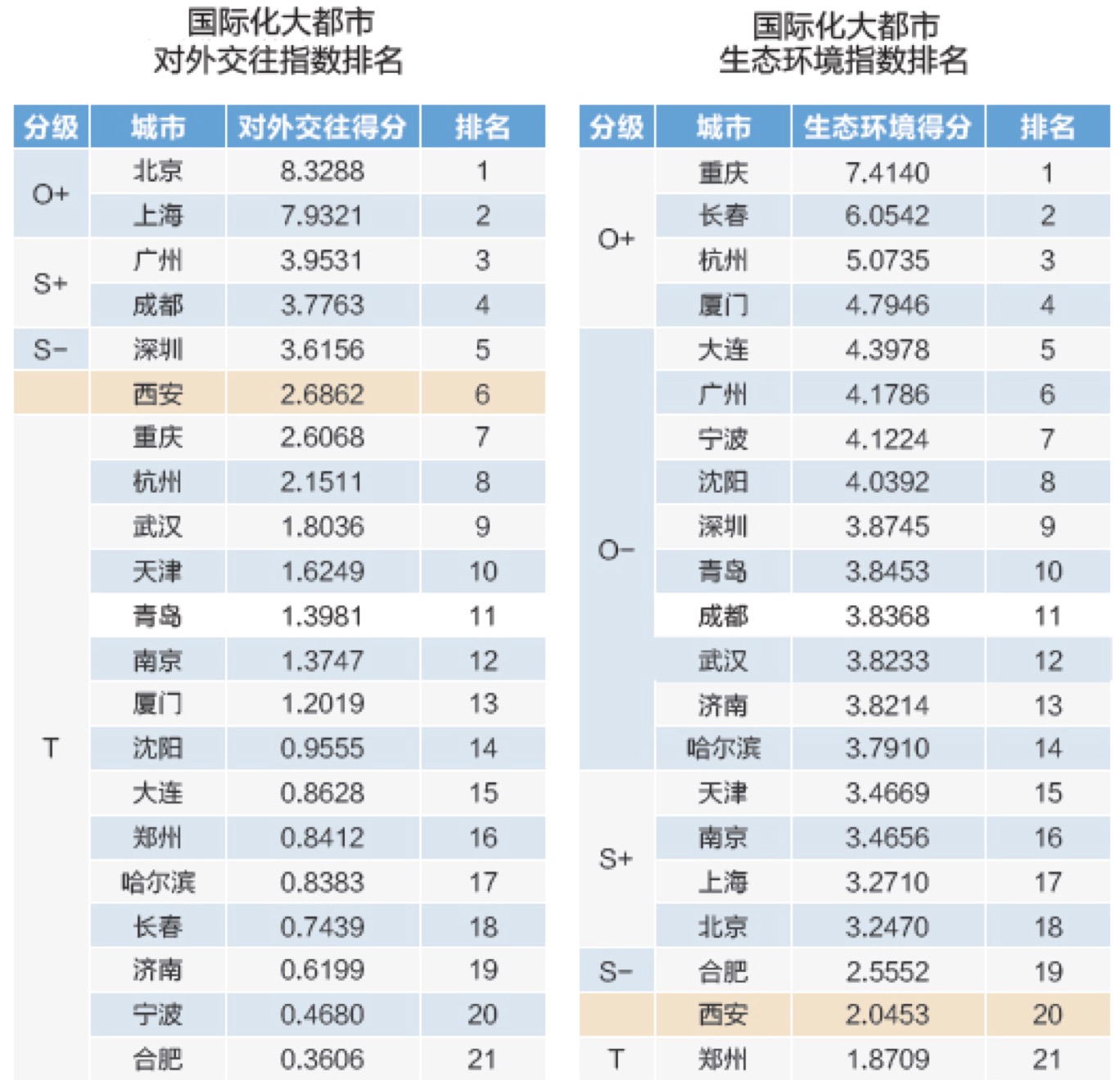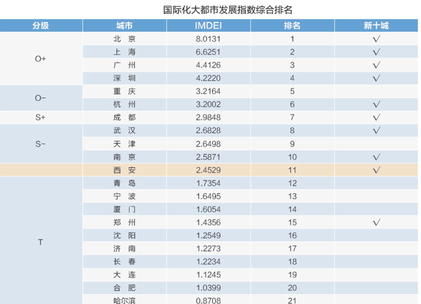 在国际化大都市发展指数综合排名中,“前十强”城市分别为北京、上海、广州、深圳、重庆、杭州、成都、武汉、天津和南京。西安IMDEI指数得分2.4529,位居综合排名第11位、国家中心城市第8位、副省级城市第7位。