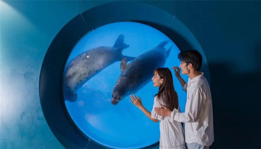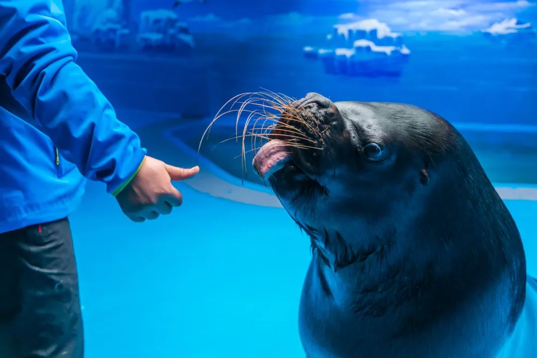 海豹、海狮等海洋动物都在今年重新装修的海豹馆惬意生活着这里被一片静谧蓝色环绕海狮身怀绝技智商也超高转圈、做运动神马的更不在话下简单的加减法我们最在行!敬礼、倒立、鼓掌更不要太可爱~