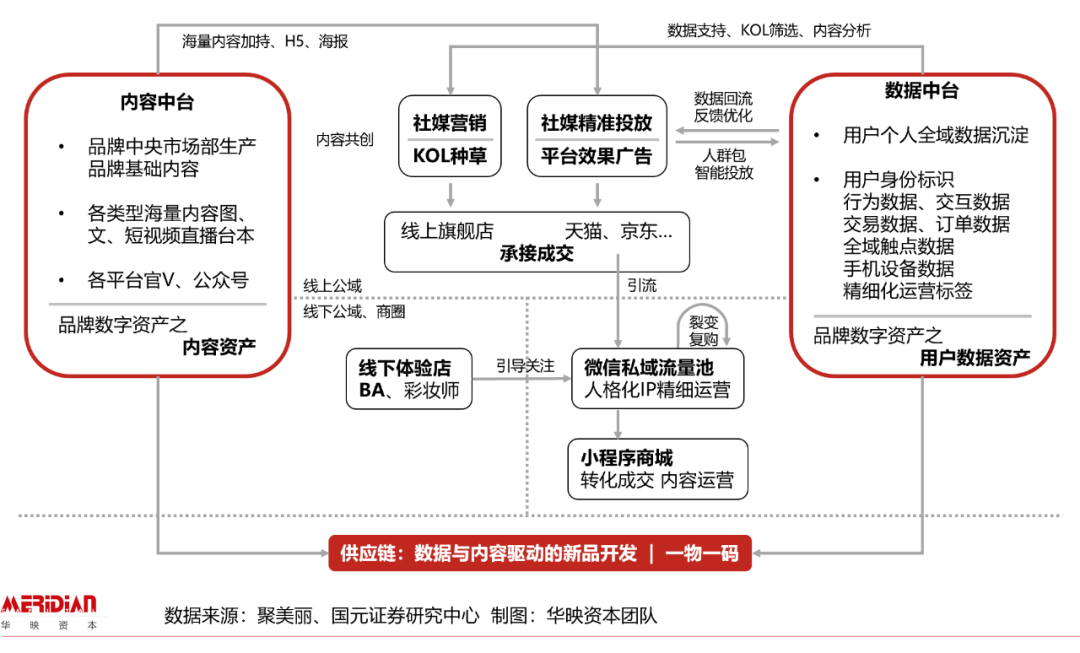 流量红利见顶,用户时长争夺加剧,促使流量运营从粗放式增长进入精细化运营阶段。社交电商通过线上的大众投放、社交网络和kol种草,将流量导入各平台店铺成交,或者线下BA导量,进一步转化进私域并通过小程序等沉淀,通过内容和数据的不断盘活,最终将品牌沉淀为数字资产。对于购买决策感性、信任壁垒高的美妆个护赛道,私域运营、重服务在当下尤为重要。