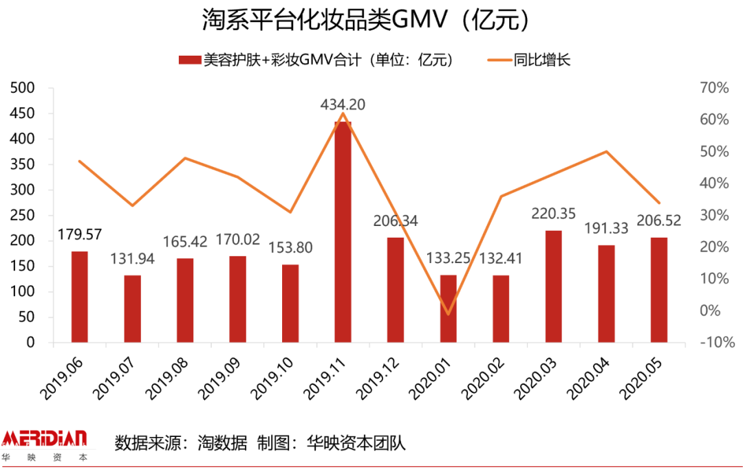 2019.6-2020.5淘系平台美容护肤+彩妆GMV及同比增长率
