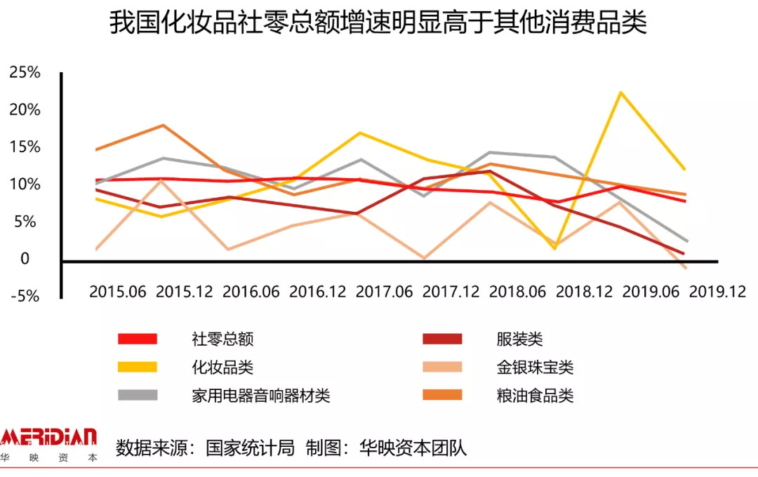 美妆个护的强劲增长在不断加速。我国化妆品类社零总额长期保持2位数增长,明显高于社零整体增速和其他可选消费品类增速。2019年,美妆、个护、家清品类增速大身位领跑整体快消品市场。