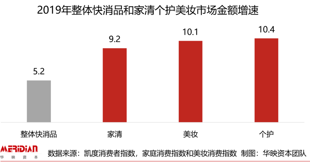 2019年整体快消品和家清个护美妆市场金额增速对比