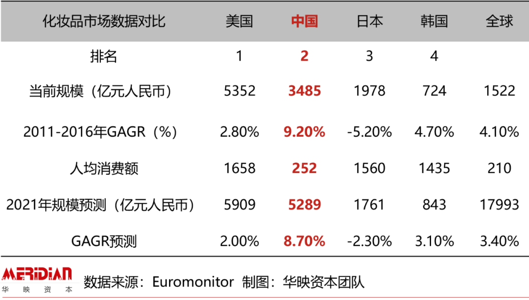 据Euromonitor欧睿数据显示,中国已是全球第二大化妆品市场,约占全球市场总规模的1/5,且年增速远超美日韩;与此同时,人均消费额却仅为上述三者的1/6左右,需求潜力远未完全释放。