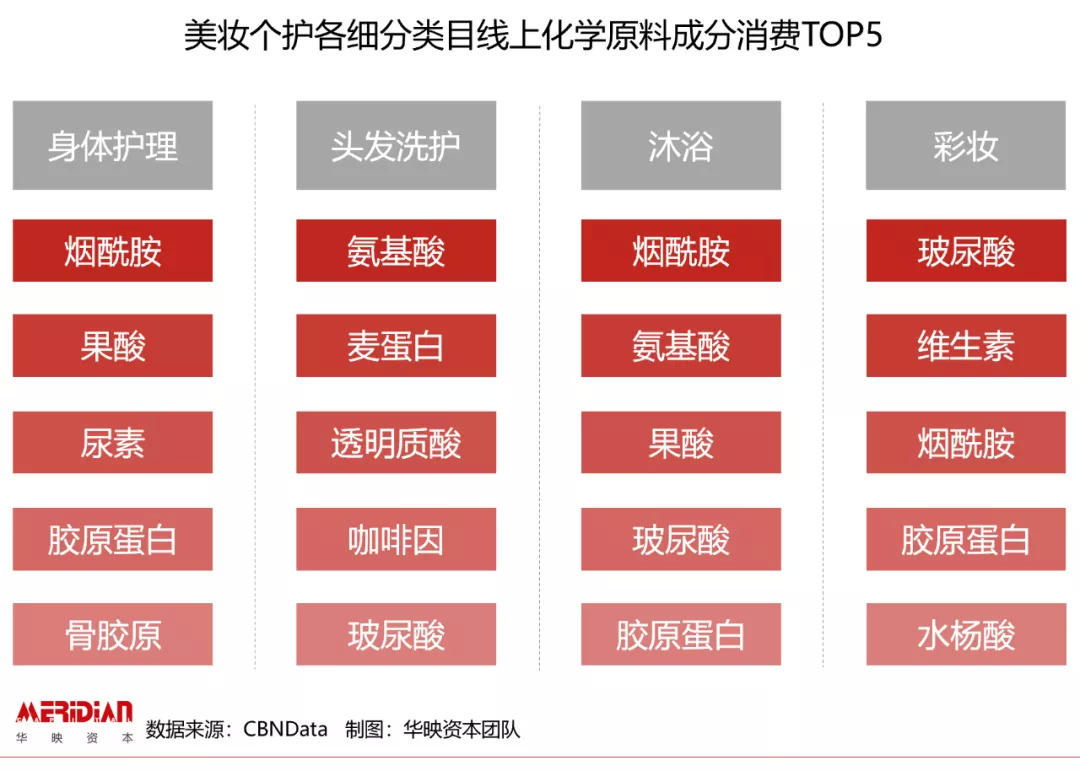 美妆个护各细分类目线上化学原料成分消费TOP5