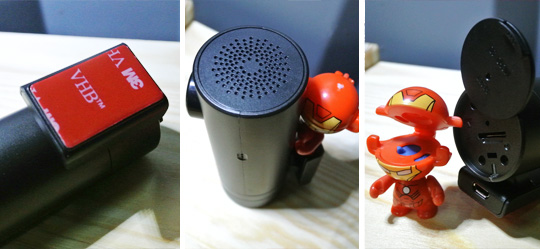 起初剑扬还在包装盒内找记录仪常用的吸盘,但怎么也没找到,原来盯盯拍mini采用的是3M胶粘,是为了更省空间?同时机身的两侧为扬声器以及储存卡插槽,而电源口被安置在支架上,这样的设计看来确实比传统记录仪更省空间,同时布线更加美观。