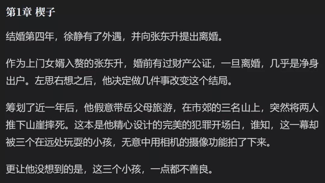 讲述了三个小孩——朱朝阳、严良、普普,无意间记录下了一个成年人——张东升,谋杀岳父母的过程。