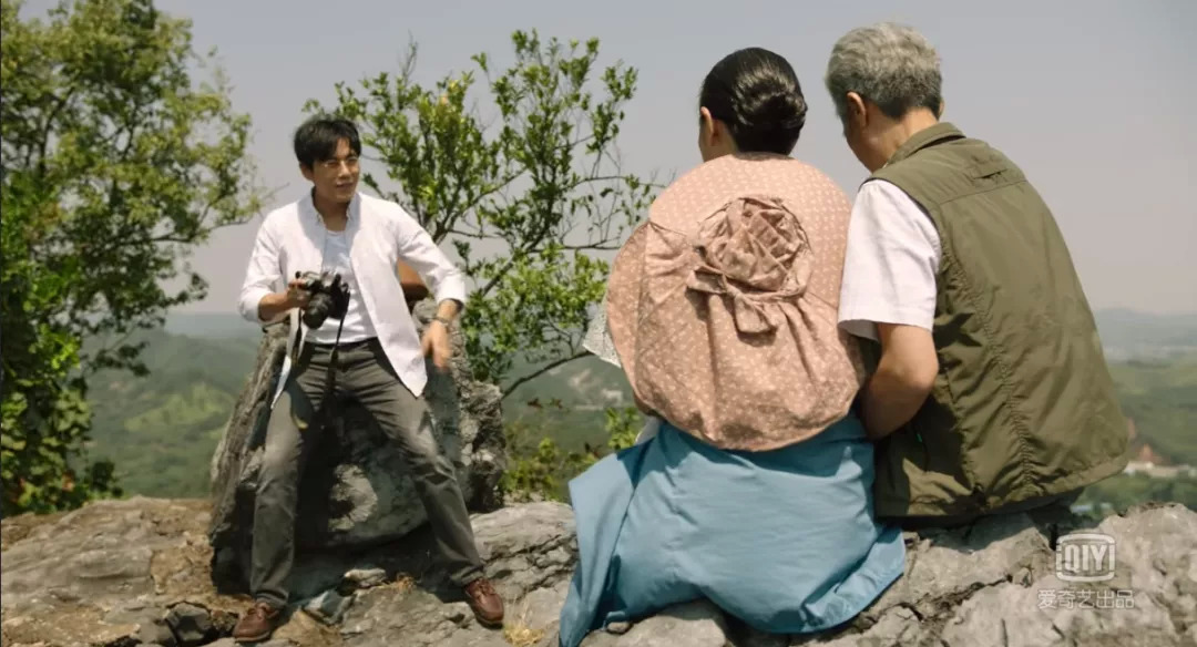 秦昊饰演的斯文眼镜男,带爸妈去爬山。