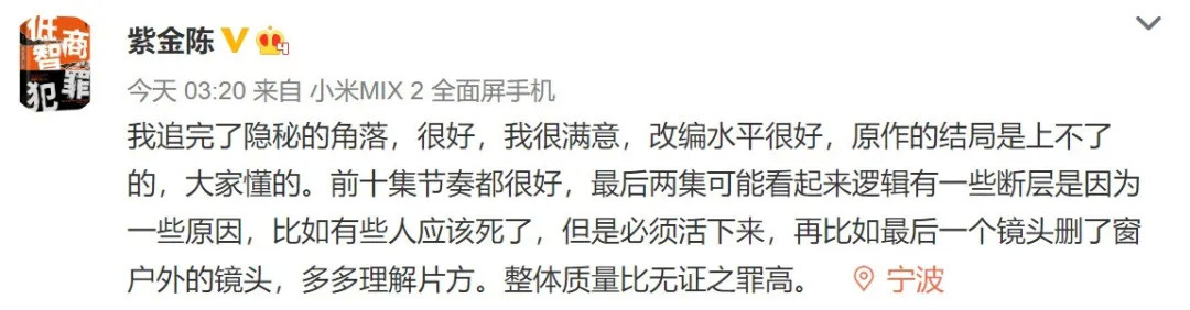 很多人包括原著作者紫金陈在看完大结局后,表示最后两集为了规避审查还是有所妥协。