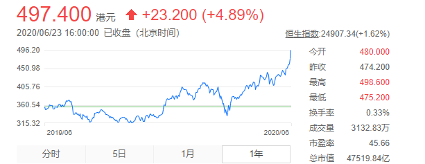 6月23日,开盘上涨3.12%,报489港元,再次刷新记录。盘中最高上涨至498.6港元,最终收盘于497.4港元,大涨4.89%,距大摩和瑞信等投行此前目标价500港元大关一步之遥。其总市值突破4.75万亿港元,超过阿里巴巴,成为中国市值第一互联网企业。