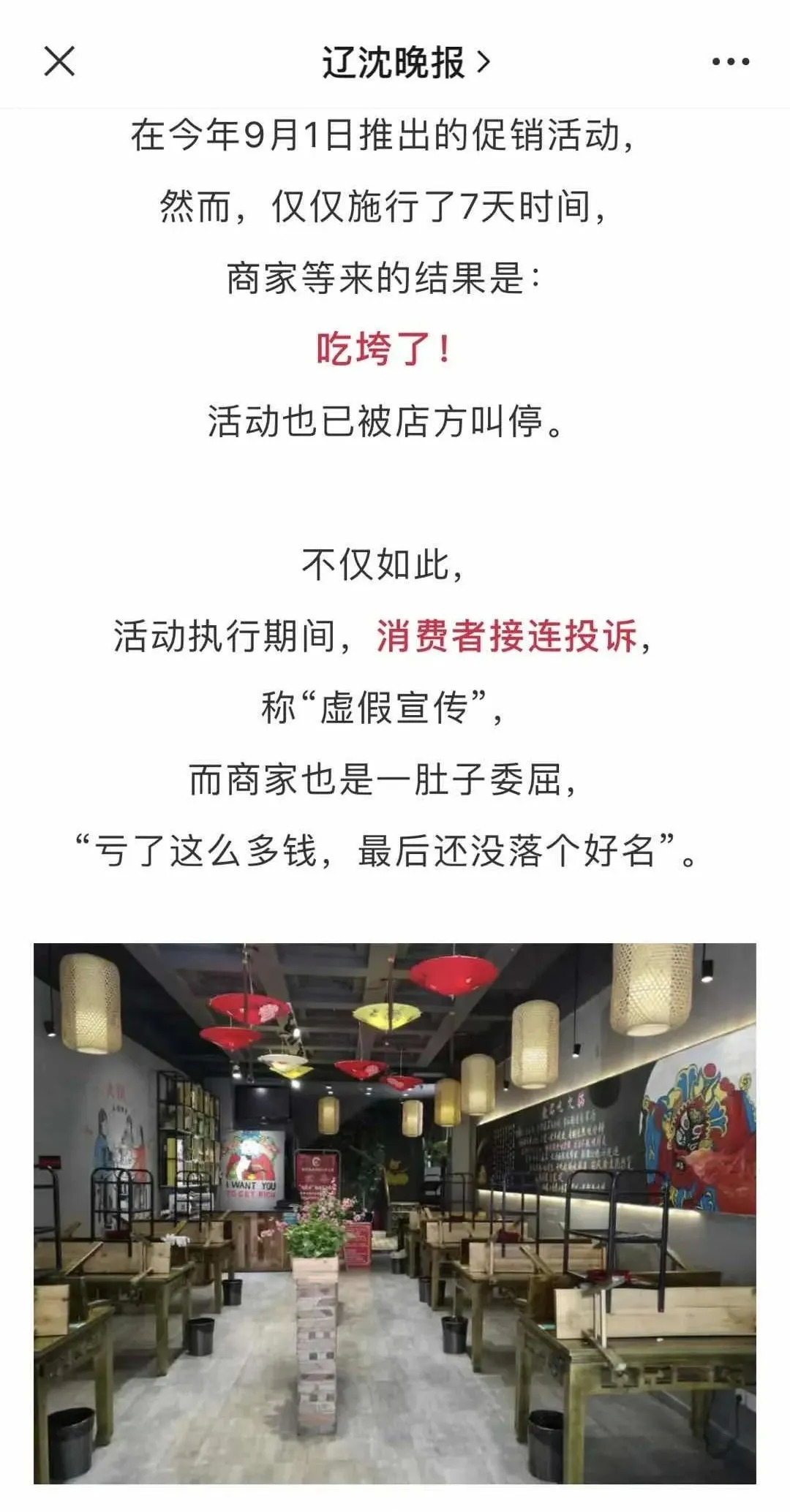 而且这还不是个例,去年看到一则新闻:位于徐州闹市区的“蜀征侯老火锅富国街店”,曾为了庆祝即将到来的20周年庆,并结合新店开业,推出了“吃货活动”,结果活动举办了7天,火锅店就顶不住压力直接关店了。