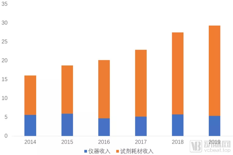 事实上在过去的六年中,Illumina的仪器收入已经基本停止了增长,销售收入一直保持在5亿美元上下。而另一方面,试剂耗材方面的营收则在不断增长。仪器收入在其产品收入中的比例已经从2014年的35.1%降低到了2019年的18.3%。