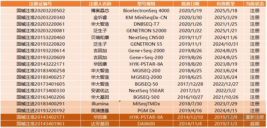 目前的测序仪主要分布在第三方医检机构和科研机构中,医院市场的开发率还比较低。随着测序需求的不断提升,会有更多测序仪深入到院内场景。想要进入院内场景,测序仪产品就必须取得医疗器械注册证。那么目前到底有哪些产品已经具备了进入临床的资格?