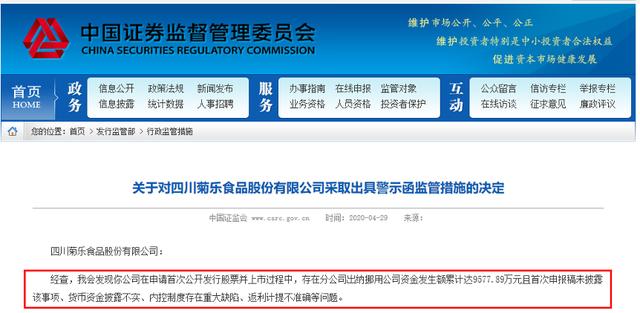 然而,菊乐食品二次提交的招股说明书却迎来了证监会的警示函。4月29日,证监会官网公布的《关于对四川菊乐食品股份有限公司采取出具警示函监管措施的决定》显示,因存在分公司出纳挪用公司资金发生额累计达9577.89万元且首次申报稿未披露该事项、货币资金披露不实、内控制度存在重大缺陷、返利计提不准确等问题,菊乐食品被证监会采取出具警示函的行政监管措施。
