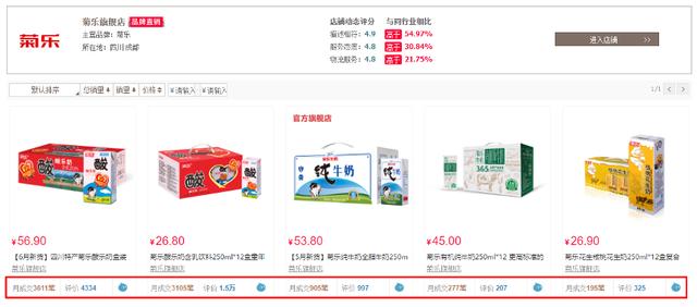 从菊乐食品天猫旗舰店来看,公司目前仅上架五款产品,其中两款为酸乐奶产品的不同规格包装,另外三款则分别是纯牛奶、有机牛奶及花核桃生牛奶三款产品,相比前者月销量超过3000笔而言,后三块产品销量明显偏低,均不足1000笔。