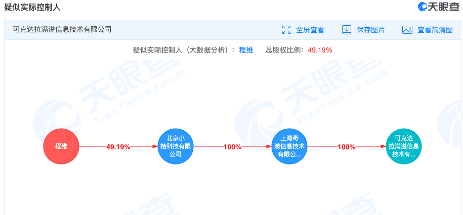 可克达拉满溢信息技术有限公司成立于2020年5月9日,成立时间尚不足两个月,注册资本100万,法定代表人为马龙强,公司经营范围包括信息技术咨询服务。天眼查数据显示,该公司的疑似实际控制人为滴滴创始人程维。