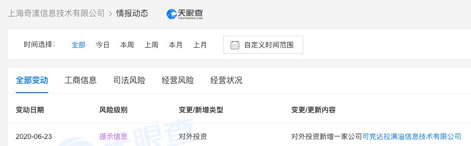 天眼查数据显示,6月23日,上海奇漾信息技术有限公司新增全资对外投资,被投资企业为可克达拉满溢信息技术有限公司。其中,上海奇漾信息技术有限公司为滴滴出行关联公司——北京小桔科技有限公司的全资子公司。