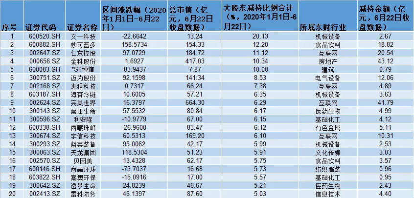 从减持规模上来看,截至6月22日,减持股份占总股本比例在5%以上的有20家,其中减持10%及其以上的有5家,分别是文一科技(20.13%)、妙可蓝多(12.20%)、仁东控股(11.12%)、金科股份(10.34%)、*ST博信(10%)。