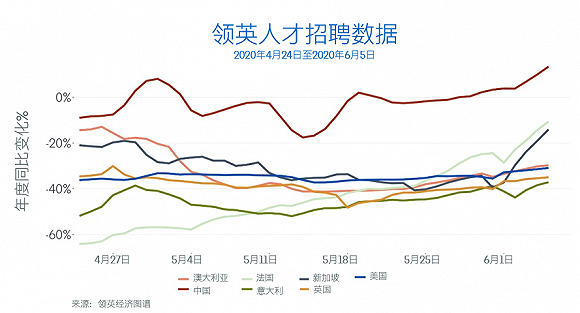 在美国,更新就职信息的会员数在四月急剧减少,与三月相比降低了24%,与去年同期环比减少了30%。然而最新发布的五月数据显示,尽管该数据相比去年同期仍然减少了37.9%,但仅比四月降低1.4%,说明人才流动的下降趋势已放缓。新加坡与法国的人才招聘数据在稳定一段时间后,六月初呈现快速回升态势。在中国,该数据在二月降至最低,与去年环比减少近50%,但目前人才招聘数据已经恢复,截至6月5日已比去年同期增长13.4%。