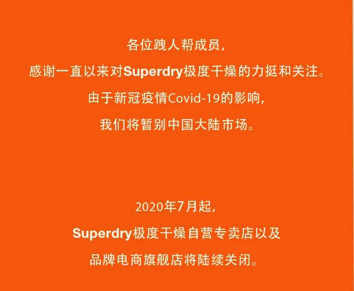 6月24日午时,英国潮牌Superdry通过官方微信号发文称,7月起将陆续关闭自营店及品牌电商旗舰店。今后将通过品牌英国官网继续运营。