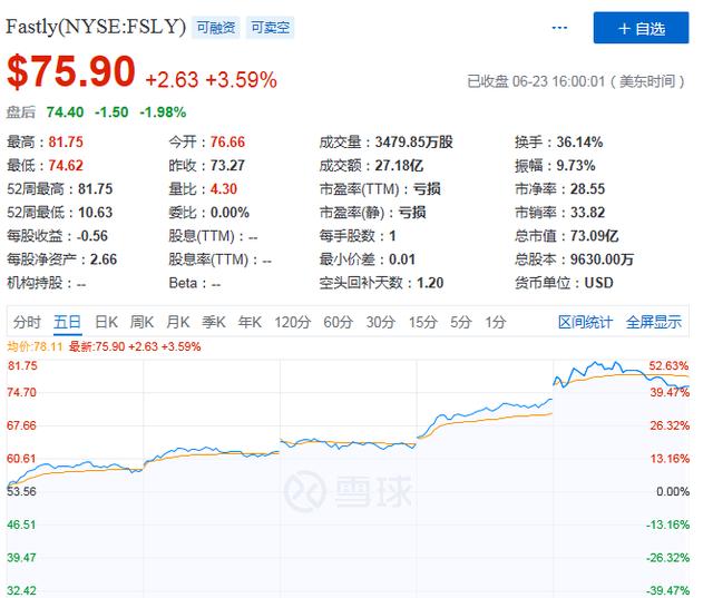 周一Fastly的股价上涨了15%,至73.27美元每股。截止周三收盘,Fastly股价为75.90美元,涨了3.59%。而上一周中,其股价也提升了36%。自今年2月19日以来,这家公司的股价已经上涨了222%,同期涨幅超越了Zoom的159%。