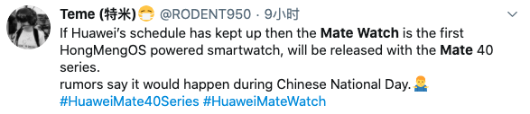 24日消息,爆料人士Teme(@RODENT950)发布推特称,华为Mate Watch将是华为旗下第一款运行鸿蒙OS的智能手表,它将与Mate 40系列同台亮相。