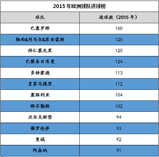 纵观全队数据,西甲霸主巴塞罗那今年累计打入160个进球,这一数据冠绝欧洲,比紧随其后的拜仁慕尼黑多出了35个进球,比拉法·贝尼特斯挂帅的皇家马德里多出了48个。