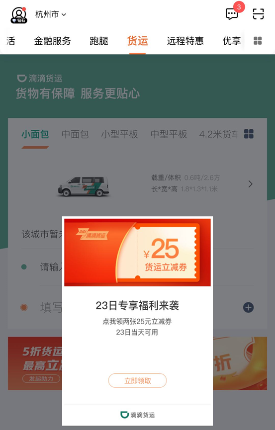 从6月23日起,成都和杭州的用户即可通过滴滴出行APP的“货运”页面发单,体验滴滴同城货运的服务。同时,用户在滴滴货运上线首日体验还可领取两张25元的立减券。