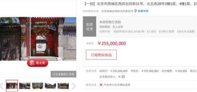 这是一套法拍房,起拍价2.55亿元,堪称“北京老城区传统四合院司法拍卖标王”。和侦探君一起吃瓜的,还有6万多个围观群众。319人设置了关注提醒,却迟迟无人竞拍。