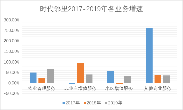 虽然营收与在管面积保持稳定增长,但时代邻里的各业务波动较大。目前,时代邻里的主要业务分为物业管理服务、非业主增值服务、社区增值服务、其他专业服务四类。在2017-2019年,物业管理服务分别实现营收3.31亿元、4.04亿元、6.78亿元,涨幅分别为49.01%、22.25%、67.75%,其中2018年增速明显降低。