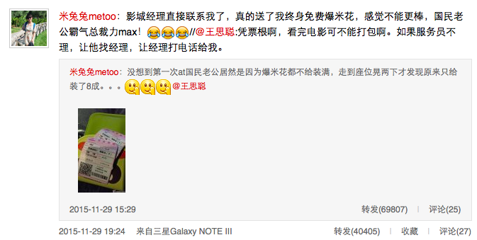 有网友在微博上吐槽万达影院的爆米花只装了八分满,并艾特王思聪求解决,王思聪随后翻牌承诺了终身免费的爆米花。11月29日晚,该网友称影城经理已经联系她了,真的送了终身免费爆米花,并感慨:“感觉不能更棒,国民老公霸气总裁力max!”
