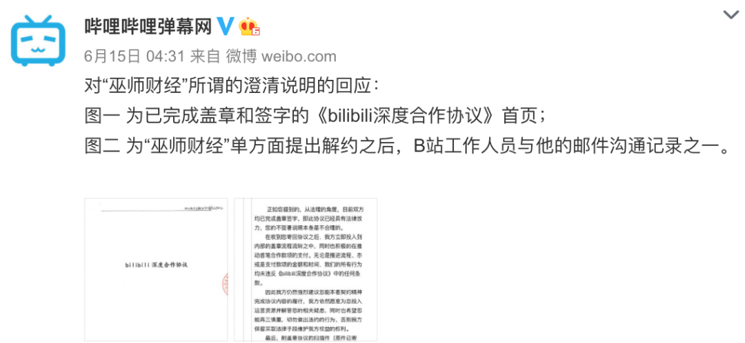 另一方面B站也毫不示弱,在官方微博上公告巫师财经单方面违约,并且直接通过平台手段暂时冻结了其账号,表示在必要时会拿起法律武器起诉。