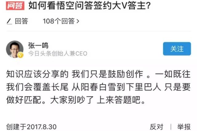 在如今西瓜视频的动作不断之前,头条系下属的另一个平台悟空问答,早前几乎也是以这种“简单粗暴直接”的方式从知乎以及微博寻找能够提供原创内容的创作者,甚至张一鸣都高调为悟空问答站台,10亿补贴这些字眼更是很容易挑动围观群众的神经。