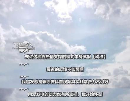 巫师财经在退出视频中也直接提到了“用爱发电的积极性下降”。巫师财经表示,“在B站发布视频的8个多月时间里,由于自身内容坚持和行业环境,他没有进行过商业变现,没有接过任何形式的广告,这种全靠热情维持内容输出的模式,在视频反馈不如预期之后,他开始怀疑‘用爱发电’的可持续性。”总结一下就是在B站想挣钱不容易。