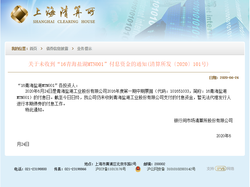 上海清算所公告称,2020年6月24日是青海盐湖工业股份有限公司2016年度第一期中期票据(代码:101651033,简称:16青海盐湖MTN001)的付息日。截至今日日终,我公司仍未收到青海盐湖工业股份有限公司支付的付息资金,暂无法代理发行人进行本期债券的付息工作。