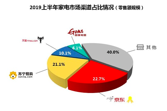这些年来,线上成为零售业的主战场,电商的兴起成就了淘宝、京东、拼多多等新玩家,家电行业的老玩家苏宁也在持续往线上转型。根据中国电子信息产业发展研究院发布的《2019上半年中国家电市场报告》(简称《报告》),去年1-6月,国内线上渠道对家电销售的贡献率进一步加大,首次超过40%。