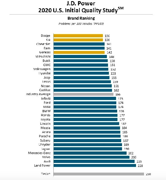 IQS是业内公认的新车质量行业基准。关键指标是平均每100辆新车(PP100)遇到的问题数量。从这次的报告数据看,特斯拉的PP100数值为并列第一名道奇和起亚品牌的2倍,后两者每100辆车得的问题数为136个。