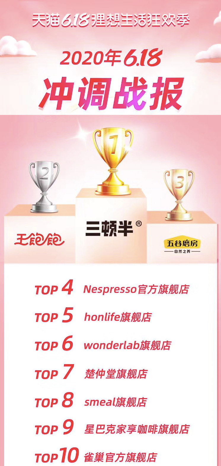 2020 年,疫情反复之下的中国消费市场,充满了不确定性。依据天猫 618 理想生活狂欢季数据,三顿半从 2019 年双 11 咖啡类目第一名开始跃升为 2020 年 618 冲调大类榜首。咖啡是冲调的子类目。刚过去的 618,排在三顿半后面的店铺,有雀巢、星巴克家享咖啡。