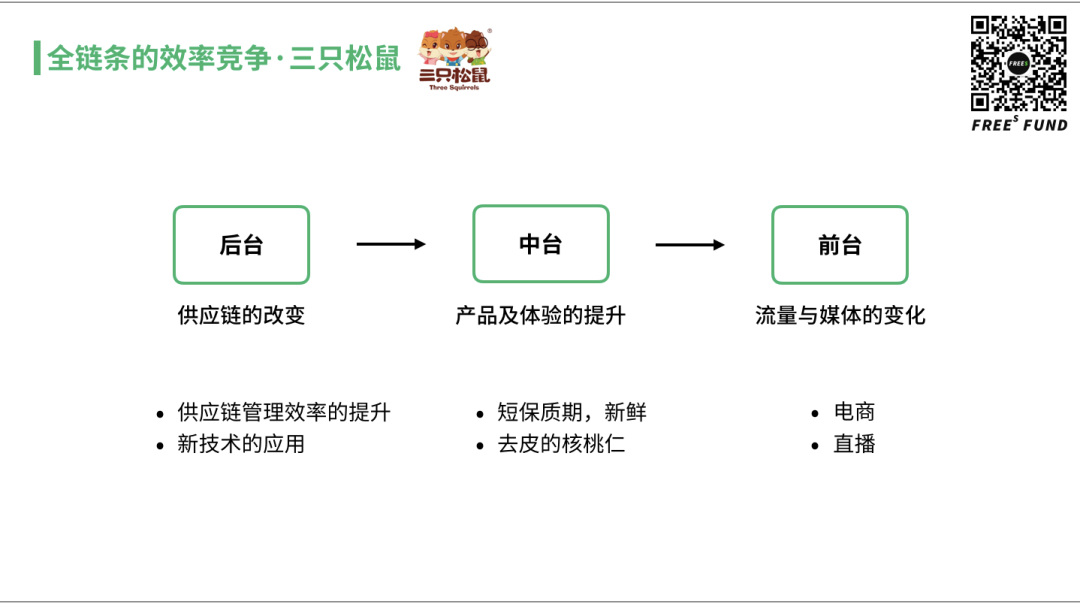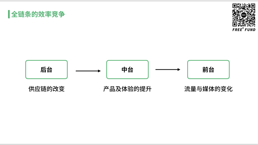 当下的消费品创新,更多地需要全链条的效率提高和体验升级,这包括供应链的优化(后台)、产品及体验的提升(中台)、抓住流量与媒体的变化(前台)。