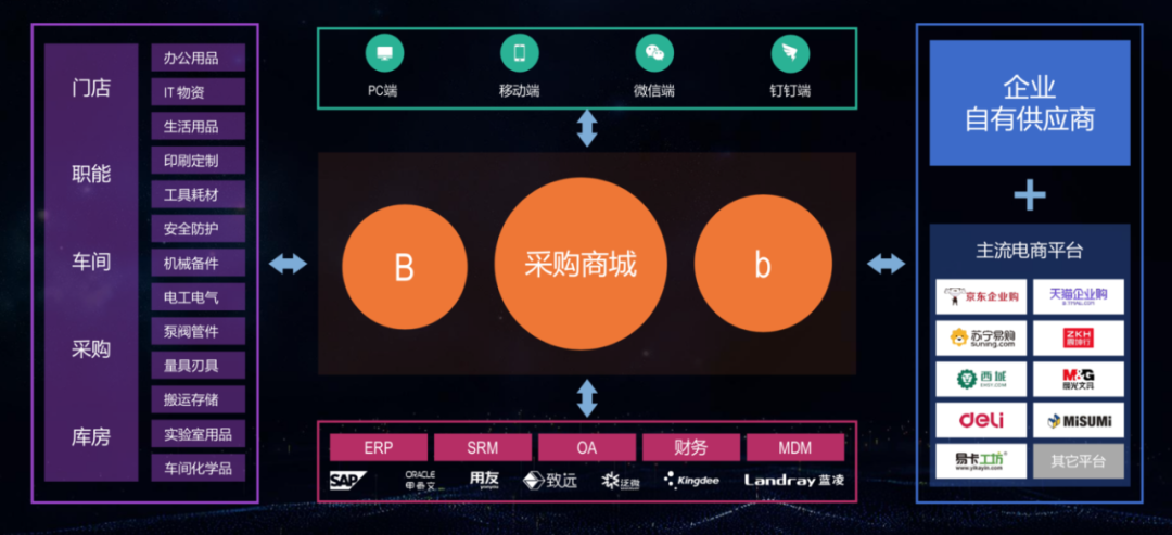 除非是中小企业或者再小一点的,它的采购比例不大,规模也不大。我们认为中小企业如果采购,一定是用生产和非生产是在一起的系统,甚至不需要系统,采购生产原材料可能就固定了供应商,而非生产采购直接到京东、天猫、苏宁等电商平台网站买开发票来报销就行。