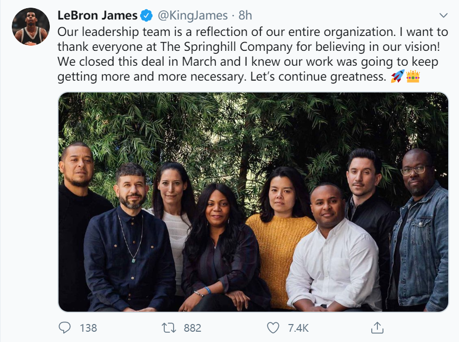 SpringHill Entertainment以詹姆斯从小长大的俄亥俄州一间公寓命名,并自称是一家专注于为少数族裔发声的娱乐影视公司。6月3日,詹姆斯宣布SpringHill Entertainment将会参与制作一部以塔尔族种族大屠杀为题材的纪录片。