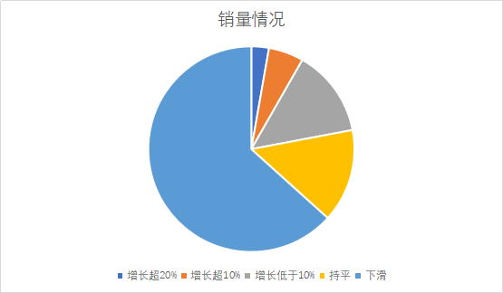 在销量方面,有3位酒商表示自己的销量有所增长或略有增长,占参与调研人数的9%。其中,增长超过20%的仅1人,占3%;增长超过10%的有2人,占6%;增长超过10%及以下的有2人,占6%。另有5人表示与去年同期基本持平,占16%,约有69%的酒商同比出现下滑。收疫情的深度影响,部分酒商下滑幅度较大,甚至超过了40%。